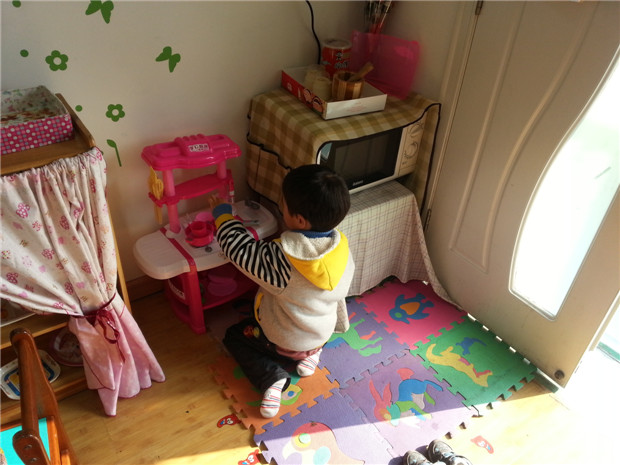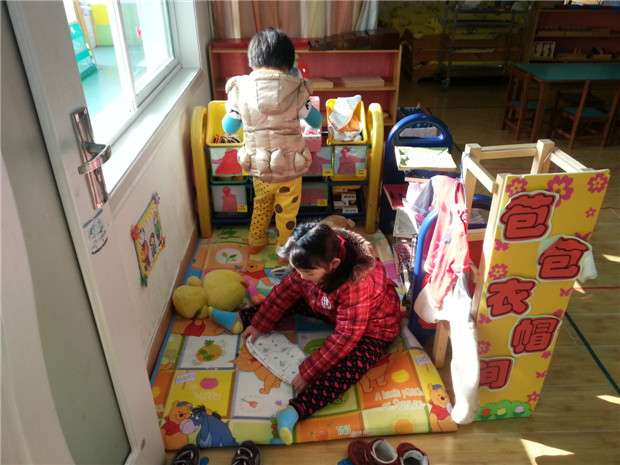 而对于小班幼儿来说,温馨的环境会让他们有安全感。娑幼花苞苞班结合主题《亲亲热热一家人》在班级环境创设上,尝试把教室布置成“温馨的家”,让幼儿感受家的温暖,小朋友们是这个大家庭中的一员。在这个“花苞苞”大家庭里有苞苞私家小厨、苞苞餐厅、苞苞书香小屋、苞苞衣帽间。小朋友每天都可以在这些地方进行主题性游戏:如小朋友们可在苞苞私家小厨里玩烧菜的游戏;在苞苞衣帽间里学习爸爸妈妈叠衣服;在苞苞书房里听听轻音乐、看看书等。