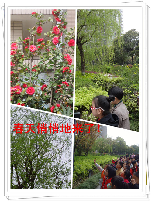 当我们一踏进小区的大门,孩子们就被眼前的美丽景色深深吸引了,只听孩子们高兴地手舞足蹈喊着:“好多柳树哦!”“好漂亮的花啊!”“这里好美啊!”“老师,那是什么树呀,树上开的花好美哦!”孩子们你一言我一语的嚷着。老师们面对着孩子们这种对春天的喜爱和强烈的好奇心,随即以优美的词语迎合着孩子们的话语:柳树发出新的枝芽,温柔的春风吹过,柳条迎风飘动,像一位美丽的小姑娘正在轻舞,又好似向人们招手问好,告诉人们春姑娘来了;那粉红的桃花,有的还是花蕾,有的已展开了两三片花瓣,露出了淡黄的花蕊,发出淡淡的清香;泥土里,小草从鼾睡中醒来,迫不及待的冒出脑袋,想看看这美丽的大千世界……孩子们听着优美的语言充分感受到了春天的美好景色。