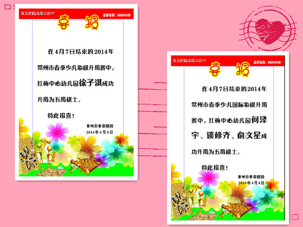 近日,红梅中心幼儿园的小棋手们参加了2014年常州市春季少儿象棋、国际象棋比赛,喜获佳绩。其中徐子淇小朋友成功升级为五级棋士;何泽宇、谈修齐、俞文星成功定级为六级棋士。