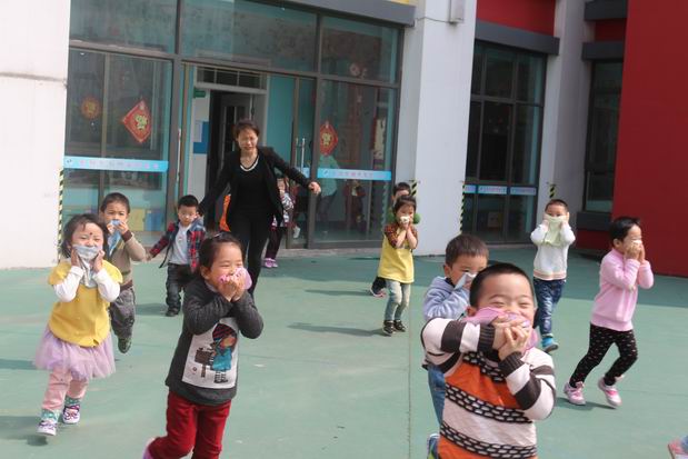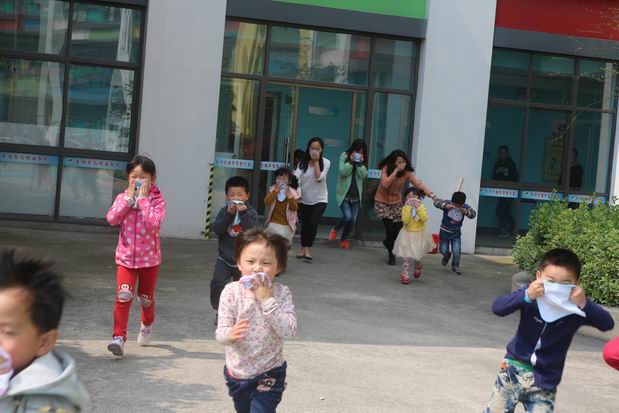 上午十点,随着一阵消防警报声响起,全园幼儿在教师的带领下,迅速用湿毛巾捂住口鼻,弯腰伏身,紧张而有序地按预定疏散路线,从“火场”逃离,疏散到幼儿园的操场上。从警报声响起到三个楼层全园师生全部撤离到指定的安全位置,用时两分半钟,演练取得圆满成功,达到了预期的目的。为确保演习活动的圆满落幕,幼儿园在前期制定了周密的预案,同时还进行了安全教育。