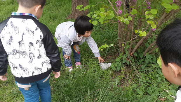 孩子是自然保护教育的主要对象,他们的环境保护意识的认识水平将决定其将来参与环境保护的程度。因此,我们在《春天真美丽》这个主题下开展了保护环境的活动。看!孩子们多么认真,在感受春天的同时,还仔细得搜索着每一个破坏春天的“凶手”。每捡到一个袋子,或者一片废纸,孩子们都特有成就感,这是他们为春天,为环境做的小小的贡献!