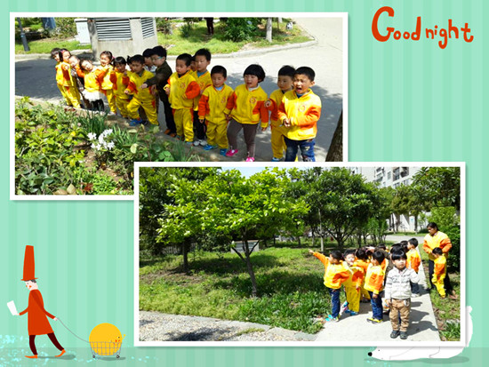 出发了!孩子们沐浴着清新的空气,一路欢歌笑语,不一会儿就来到了金梅小区。在小区里,孩子们发现了变化的足迹:“小草从泥土里探出头,嫩嫩的、绿绿的”、“各种各样的花都开放了,有雪白的梨花、粉红的桃花、金黄的蒲公英花”、“柳树上长出了嫩绿的小芽芽”、“勤劳的小蜜蜂也飞来了” ,幼儿高兴的用手触摸、亲近它们……看到公益广告牌上的广告“爱护小区绿化,人人有责”,幼儿们停止了他们的活动,同时一些幼儿还对这些广告语产生兴趣,他们你一言、我一语地议论着:这个字我认识,是“人”,那个字我认识,是“小”……。接着小朋友边走边参观,看到了爷爷奶奶、叔叔阿姨们轻松地在健身广场活动,锻炼身体,享受春天的气息,也看到了小宝宝们也在爸爸妈妈的陪伴下,咿呀学步,享受阳光!