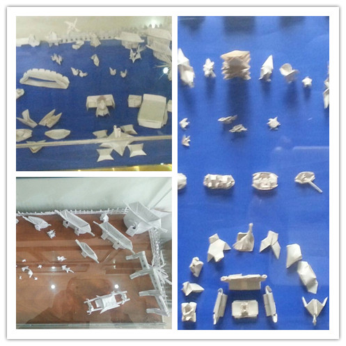 龙墅集艺馆中展出了徐汉平老师的自创200多件折纸作品,大到门楼,小到板凳,样样都有,甚至是小孩抽陀螺、滚铁圈也用折纸描绘了出来,连起来看宛如一幅描绘老常州风貌的画卷。在徐老师手中仅凭一张小小的纸,马上能将花鸟鱼虫衣裤鞋帽瞬间“变”出,徐汉平老师介绍:折纸作品虽小,却不容小觑。每一件作品的折法都是自创的,不用胶水,就用一张白纸。”