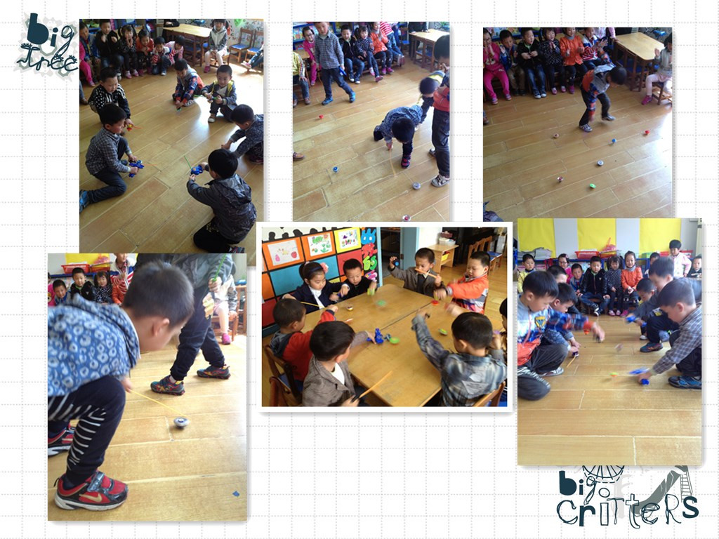 随着主题活动“我们身边的科学”层层深入地展开,孩子们对身边的一些科学现象特别感兴趣,一个小小的陀螺,就引起了孩子们极大的热情:“为什么陀螺会转不停?”“为什么有的陀螺转得时间长,有的转得时间就短呢?”为了让孩子们能解开这些谜团,便就出现了开头的一幕。活动室内,孩子们自由组合,和小伙伴们PK比赛旋转陀螺,通过游戏的形式,孩子们在实践操作中了解到了陀螺的组成、结构。在一次次的比赛中,总结出了经验,同时也寻找到了答案,知道哪种陀螺旋转得时间长,哪种方法可以让陀螺转得更快……瞧!连班里的小淑女也参加到比赛的队伍里去了。