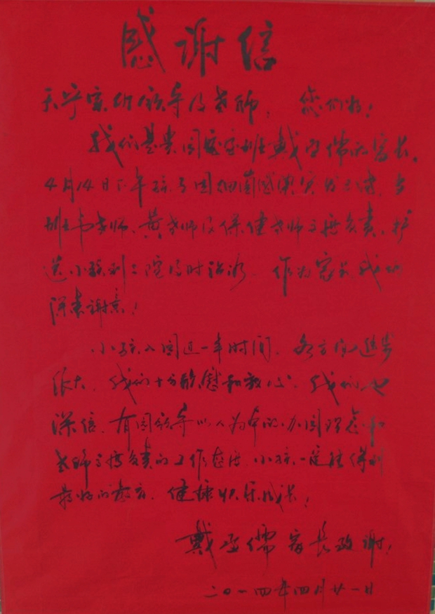 细说这封感谢信的由来:原来是4月14日下午 戴丞儒小朋友突发急病,实验幼儿园立即启动相应的应急预案,幼儿园各部门各负其责,并以最快的速度把孩子送至常州市第二人民医院进行治疗,与此同时班级 老师也在第一时间内打电话通知孩子的妈妈到医院会和,医生在听取老师和孩子妈妈口述病情后立即采取了必要的救护措施,使孩子转危为安……