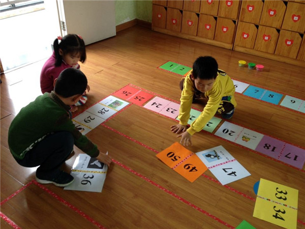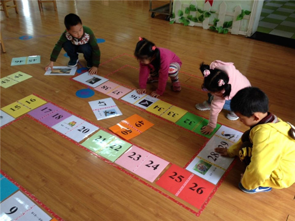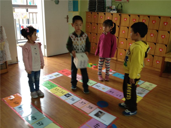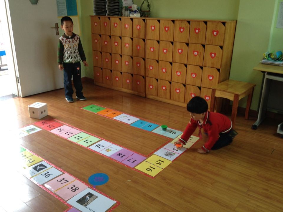 在“快乐棋区”中,老师结合了主题《你好,小鸟》,将各种鸟类加入到了棋谱中,碰到鸟类是进3格或5格,碰到蛇、老虎等则是后退几格。但是要想玩这个棋谱可不是那么简单,首先玩之前孩子们要根据老师地上的线路图将棋谱按照“1——50”的顺序摆好。这不,当老师要求交代完后,孩子们相互合作开始摆放棋谱,当棋谱摆放成功的一瞬间,孩子们都欢呼雀跃,为自己的成功感到高兴,也都开始迫不及待地玩起了该棋谱。