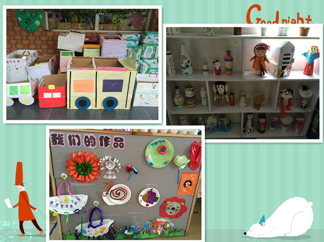 每个活动室里都可以看到用废旧材料装饰的“变废为宝”,收集了孩子们生活中许多即将丢弃的物品,有纸盘、饮料瓶、各种包装盒……千万别小看这些废旧物品,它们可是老师和孩子们手工制作的原材料呢!