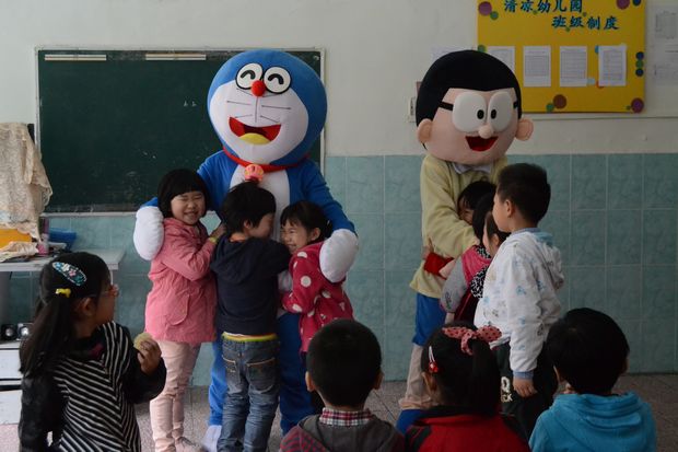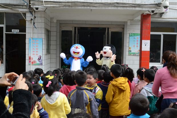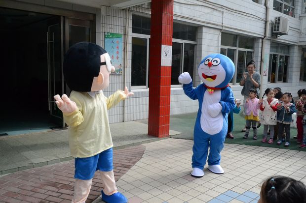 近期,清凉幼儿园的操场热闹非凡!孩子欢聚在幼儿园操场,翘首盼望着神秘的小客人。在孩子的欢呼声中,快乐天使——多啦A梦和小伙伴大雄出现了。孩子禁不止激动的拍手欢迎可爱的小客人。