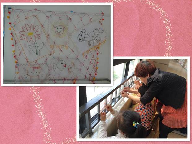 在我园开展的“基于幼儿视角的民间美术”活动中,也非常注重环境的营造。老师们收集各种民间元素材料,布置成剪纸区、刺绣场,风筝墙、脸谱窗、青花瓷馆……,为幼儿创设了一条民间艺术的观赏、制作长廊。孩子在浓郁的民间艺术氛围里,耳濡目染,再加上教师有意识地激发和引导、幼儿的主动感知,使得每个孩子在看看、玩玩中获得丰富的审美体验,有效地增强了他们对民间艺术的敏感性和感知能力。