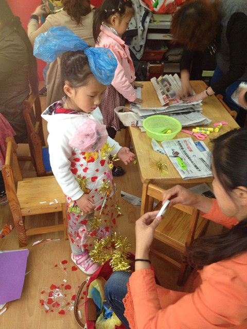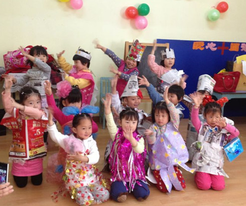 在本次半日活动中,各位家长自带材料,经由幼儿园提供的胶水、双面胶、胶带、笔、剪刀等器具,通过各自的聪明才智,为孩子们搬入新园增添了节日的气氛。每一位家长的设计都独具匠心。家中极少使用的蚊帐,在家长的手中,就是一件美丽的“套裙”;许久不曾使用的磁带,经过家长的“层层缠绕”,也能变为一件美丽的“皮草”;经常使用的餐厅纸、塑料袋,在家长的眼中就是美丽的“短裙”;一块简单的纱布,简单的裁剪与绘画,就是“王子”美丽的“新衣”;要看最普通的报纸,家长们都认为它是孩子们完美的“风衣”、“西装”、“礼服”等。整个盛装制作过程,充满了和谐的音符。孩子们穿上家长们设计的盛装,在《我们爱照相》的背景音乐下,走上T台,进行时装表演,孩子们轻快的步子彰显表演的魅力。
