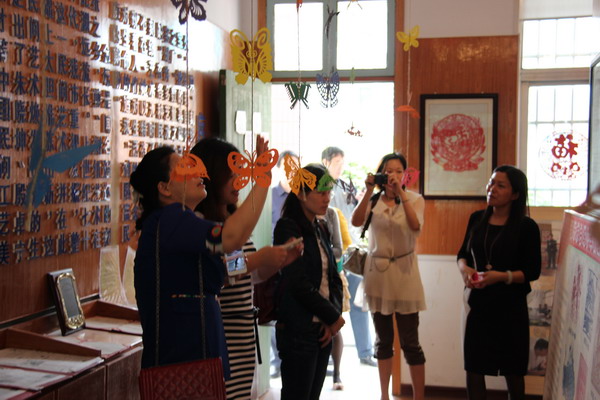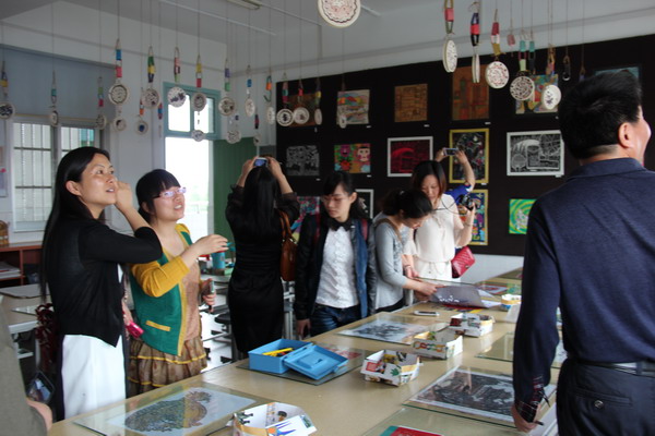 随后,在校领导的带领下我们参观了白塔小学的校园,不仅感受到了白塔小学剪刻纸教育的历史渊源,也领略了学校将“剪刻纸”作为校本课程开发与利用的策略,特别是学校的剪刻纸展览室、曹钰姣老师(市级剪刻纸传承人)工作室里的精美作品,独特创意给我们留下了深刻的印象。