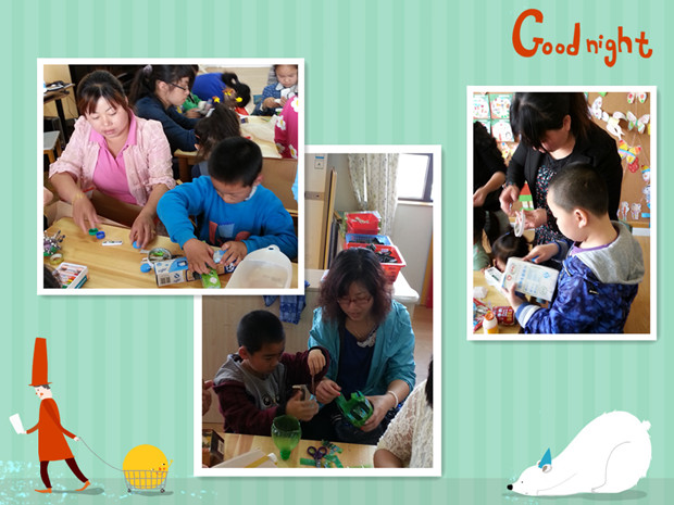 本次活动,得到了家长们的积极响应,活动前几周,家长与幼儿就开始收集生活中常见的废旧用品,有废报纸、牛奶盒、矿泉水瓶、纸杯等物品;在活动中,在父母与孩子的巧手下又变成了孩子们喜爱的玩具、装饰品等,既显示出作者的别出心裁,又表达了将环保融入生活的强烈意识。最后家长和幼儿共同将制作的物品投放到区域活动中,让幼儿在与废旧材料的互动中获得主动发展,促进全体幼儿的平衡发展。