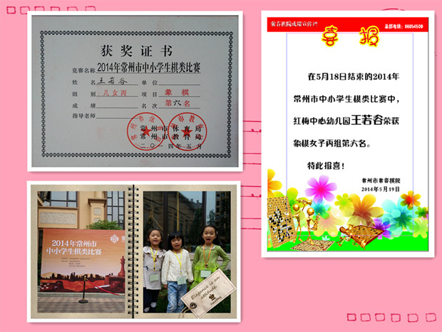2014年常州市中小学生棋类比赛于5月18日在雅居乐星河湾落下帷幕。本次比赛云集常州市300多位选手参赛,是常州市最高水平的赛事。红梅中心幼儿园王若谷、孙楠静、姚瑶、冯子湉四朵金花首次参加象棋女子丙组比赛,4位小棋手是参赛选手中年龄最小的选手。