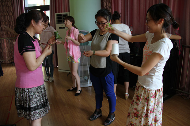 本次包粽子活动吸引我园众多老师参加。在活动现场,只见老师们双手麻利地将粽叶卷成漏斗状后,用糯米、酱肉充实压紧,再用绳一绕、一捆,一个可爱、鲜绿的“生命”就这么诞生了。卷叶、裹米、包扎,看似简单的几个动作,学起来可并没有那么容易。初学者将绳子缠来绕去,不是包成扁的了,就是粽子包漏了。尽管如此,大家还是认真学习,窝叶、放米、造型、捆绳。大家互教互学,切磋技艺,现场气氛热烈,其乐融融。
