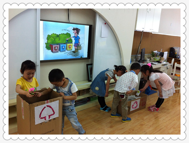 你看,孩子们正在进行垃圾分类的教学活动,通过对电池、过期药品等归类为“有毒有害的物品”;骨头、剩饭等归类为“厨房垃圾”;易拉罐、旧报纸则归类为“可回收的物品”……孩子们已经学会了对常见垃圾的分类,并能准确投放到正确的垃圾桶里。