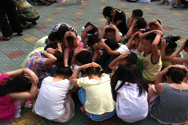 事先,老师们针对各班的具体位置设计了专门的撤离线路,防空警报一响,孩子们在老师的引导下,迅速做出反应,采用各种方式躲避危险,并以最快的速度进行撤离,老师们不时地提醒着孩子们“抱头”、“蹲下”。孩子们在老师的带领下,快速有序地经过安全出口,撤离到安全区域,来到操场空旷地带。