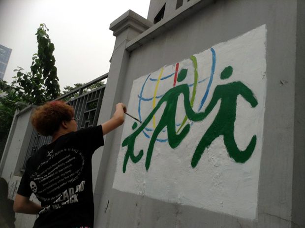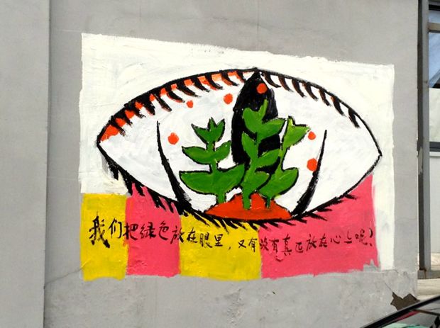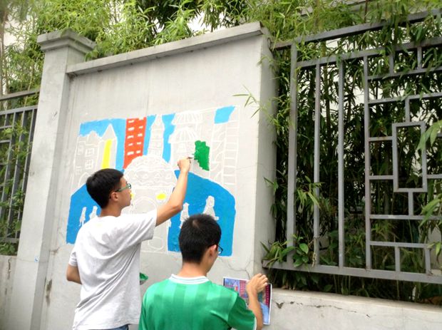 学生志愿者和青山湾的老师,共同把他们所学的环保知识和专业技能应用到美化校园环境上,绘制了以绿色环保为主题的近30米墙画,画面色彩亮丽,立体生动,扮靓了校园。环保墙画艺术创作受到了社区居民的一致称赞。