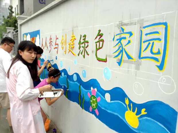 为了营造一个“绿色、文明、卫生,健康”的校园环境,提高师生的环保意识,普及环保知识教育,共建生态地球。暑期,来自常州市第五中学美术班的环保志愿者和北幼青山湾的老师们,冒着酷暑,以现场创作环保墙体宣传画的形式向社区居民、师生共同倡导爱护环境、从小做起的环保理念。