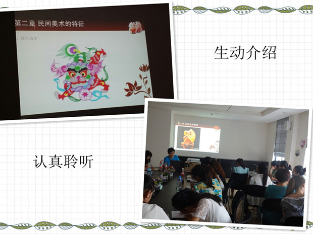 8月26日下午,常工院美术系韩老师在广化幼儿园会议室,给我园22名教师上了一堂生动形象、内容丰富的民间美术欣赏普及课。