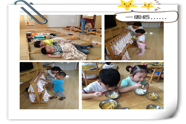 两周的活动中,教师精心组织了动静交替、室内外结合的活动,如快乐自由的体育游戏“彩虹桥”、“小青蛙跳荷叶”;亲切愉快的点名游戏、生动有趣的洗手儿歌;丰富多彩的自选游戏;温馨有序的餐点活动等等。这些活动,让孩子在快乐的游戏中潜移默化的掌握了一些生活的基本小技能,培养了孩子初步的规则意识,同时也体会了幼儿园生活的有趣,减少了对家长的依恋。