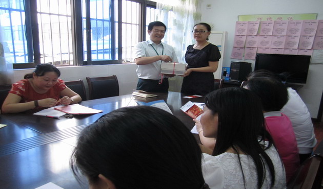 在教师节来临之际,朝阳邮政支局的领导来到朝阳幼儿园,送上了一份特别的爱。为我园教师捐献了一批图书。