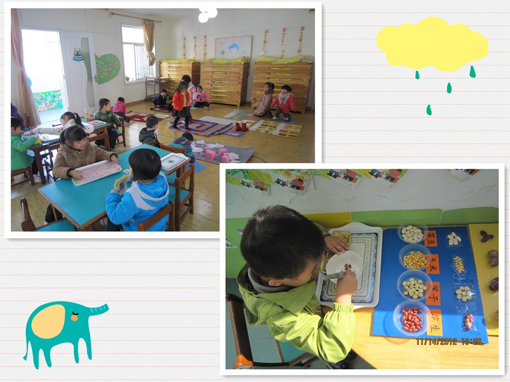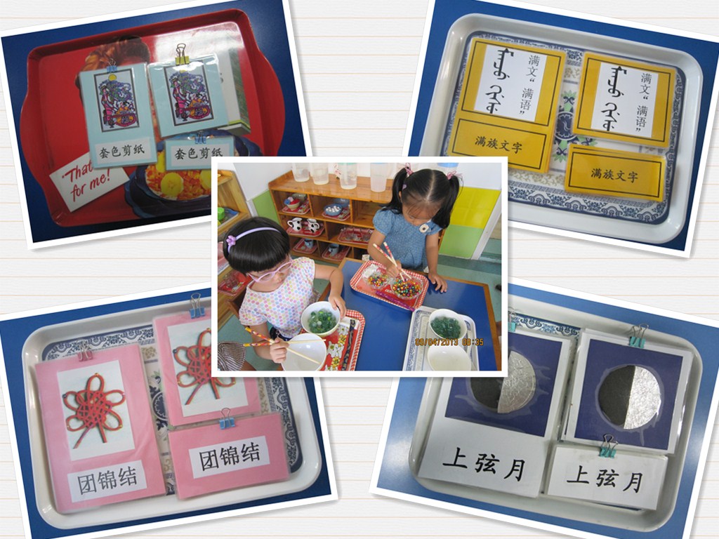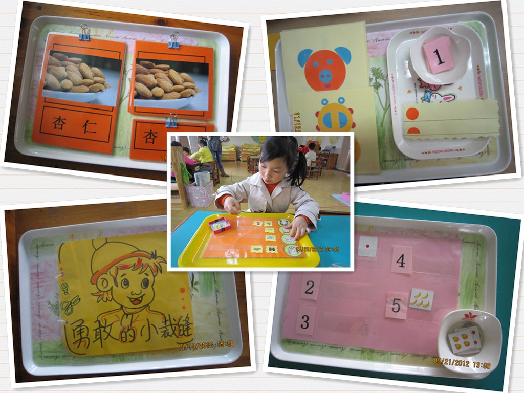 特别是在实施蒙氏教育过程中,我园将制作和设计蒙氏延伸活动材料作为教研活动中的重点,结合幼儿不同年龄特点,制作了很多的蒙氏延伸材料,为幼儿提供了丰富的操作材料。老师们为孩子们制作了丰富多彩的蒙氏延伸工作投入到科学文化区,孩子们特别喜欢,蝴蝶三部卡、图片配对、十二生肖转盘、儿歌三部卡、昆虫卡片、五十六个少数民族图片字卡配对、中国名胜古迹、世界名胜古迹、风景名胜、汽车图片字卡配对、水果蔬菜分类、花卉图片三部卡、水果蔬菜三部卡、各种各样的树、剪纸图片配对、量词宝塔、认识二十四节气、月相三部卡、活动日历等等,这是孩子们的最爱。瞧!孩子们工作的多认真呀!