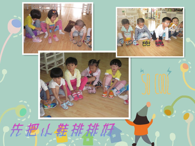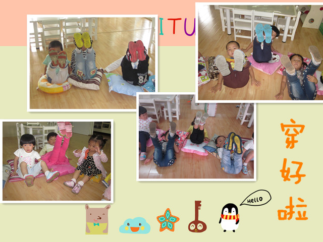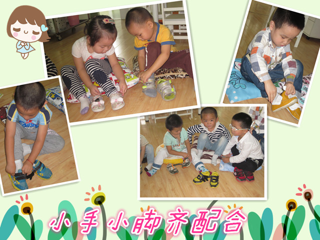 本次活动的宗旨不仅是让小朋友学会穿鞋,更重要的是帮助他们增强“自己的事自己做”的自我服务意识。活动要求幼儿在规定的时间内穿好自己的小鞋子,看看哪个小朋友穿的又快又对。在比赛过程中,随着老师一声“开始”,每个小朋友都以最快的速度拿起小鞋子,摆好左右然后穿到小脚上,穿好的小朋友还炫耀般地把自己的小脚抬起来给老师看,大声说着“老师,你看我穿好了”!没有穿好的小朋友也不示弱,依然一再地尝试,而旁边的小朋友也开始给他们加油打气,活动的最后全体幼儿都抬起自己的小脚,欣赏着自己的“劳动成果”,可开心了!
