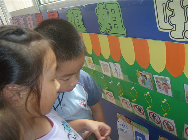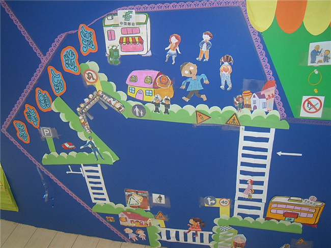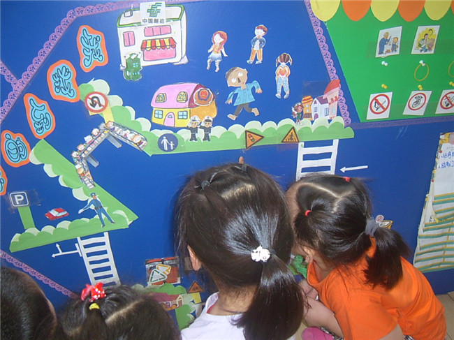 本班教师在加强交通安全知识宣传,积极倡导关爱生命的同时,利用会“说话”的主题墙,帮助幼儿自觉遵守交通规则,学做一个安全文明的小公民。你瞧,主题墙上的模拟马路体现了丰富的教育价值,孩子们在找找,议议,摆摆过程中,不仅学会了辨别简单的交通标志,还掌握了更多的安全小知识。