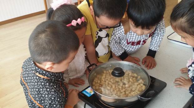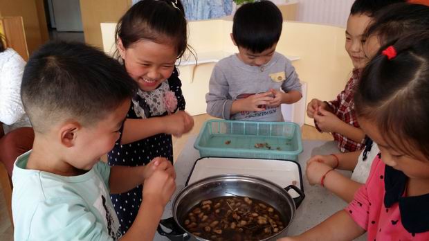 “春天时我们在每个土坑里种下了三颗花生,猜猜现在里面有多少花生呢?”“收获花生的方法有哪些?”孩子们带着老师的问题,纷纷奔向幼儿园的种植园地。他们双手抓住花生秧,从土里使劲向外拔。瞧!孩子们终于将花生连根拔起,花生秧上挂满了胖胖的花生,还沾着泥土呢!孩子们用力甩一甩,花生上的泥就纷纷落下来了,个个脸上露出幸福的笑容。接着,孩子们和老师一起从花生秧根部把花生果一粒粒摘下来。不一会儿,他们就摘了满满一大盆花生。最后,孩子们将收获的花生清洗干净并煮熟,与小伙伴们共同品尝、分享。
