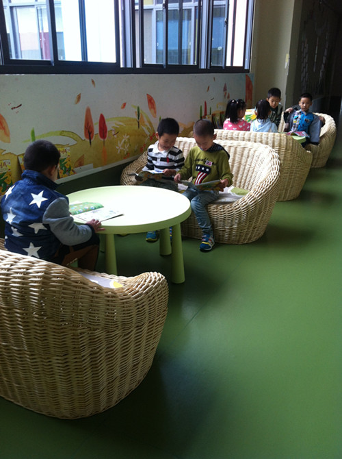 在幼儿园二楼的走廊里,幼儿园为我们提供温馨舒适的小沙发,符合孩子年龄特点的各类图书。让孩子们每天都在这里看一看、说一说、议一议、想一想。