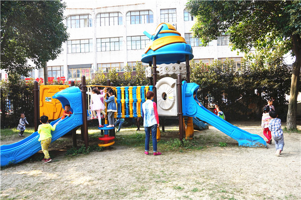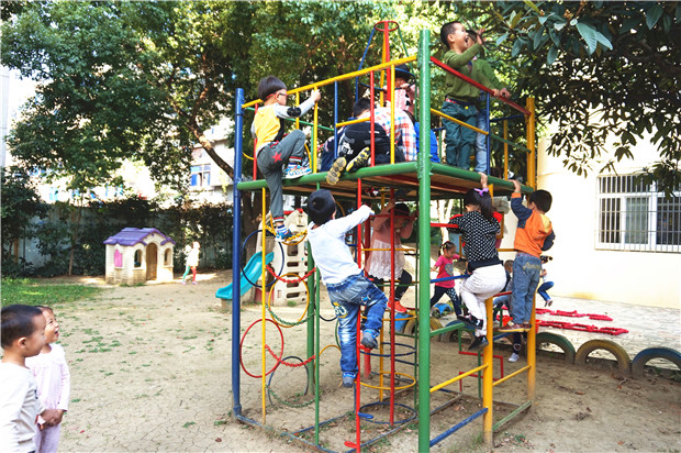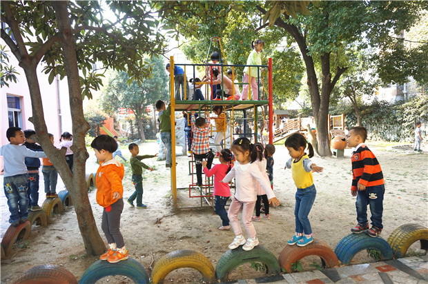这个“绿色、天然”的活动场地是幼儿园特意为孩子建造的:绿草如茵覆盖着松软的泥土,孩子即使跌倒也不会摔疼;几棵高大的树木撑起亭亭华盖,错落其间,给孩子带来一片阴凉;色彩鲜艳、造型多变的大型运动器械矗立在草坪中央,发展孩子的多种运动能力,锻炼孩子的胆量。
