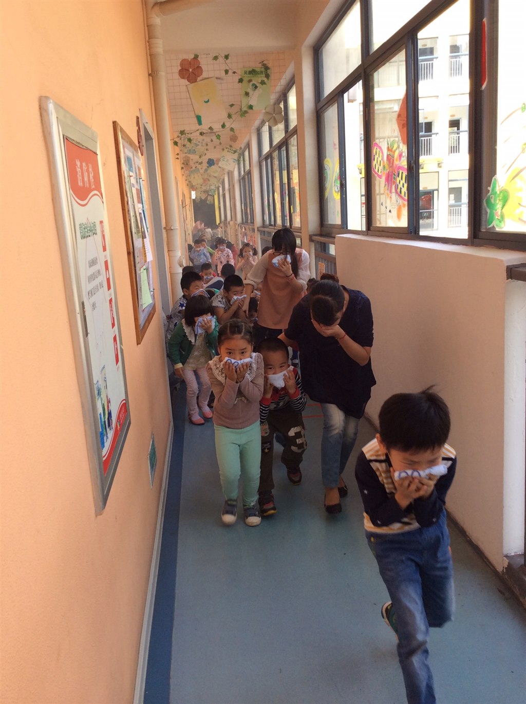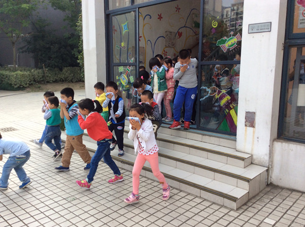 撤离演练准备工作做好后,随着火警音乐声幼儿园消防疏散演练开始,参加演练人员各就各位,各班幼儿用手帕或衣袖等捂着口鼻,猫着腰有序地按指定路线“逃生”,各班老师带着本班幼儿有序地疏散到指定安全区域。