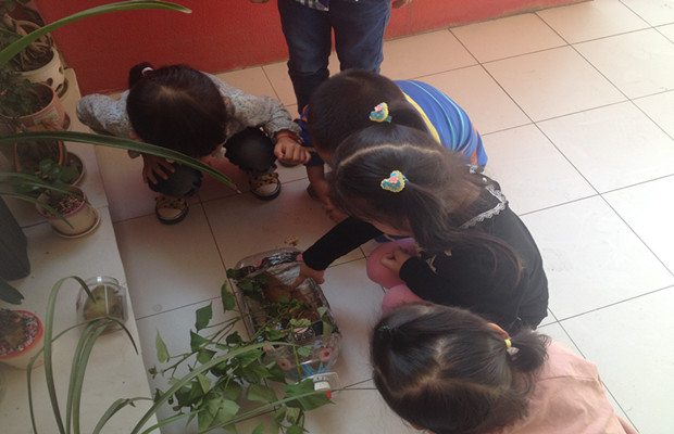 活动中,不同年龄段根据本班的实际情况,创设了各具特色的自然角环境:大班的自然角中侧重突出了“种子发芽”的试验,在泥土飘香的苗圃中,让幼儿了解种子发芽需要足够的光照、水分和土壤;中班的自然角格局清晰,养殖区,盆栽区、种子培育区应有尽有,还有顺应秋季特色的土豆、山芋、胡萝卜发芽等水植培育;小班则充分利用了自然角展架,将各种物品摆放错落有致,仿若成了一个生机勃勃的绿色生态园,可爱的乌龟、金鱼,各种美丽的植物让人流连忘返。