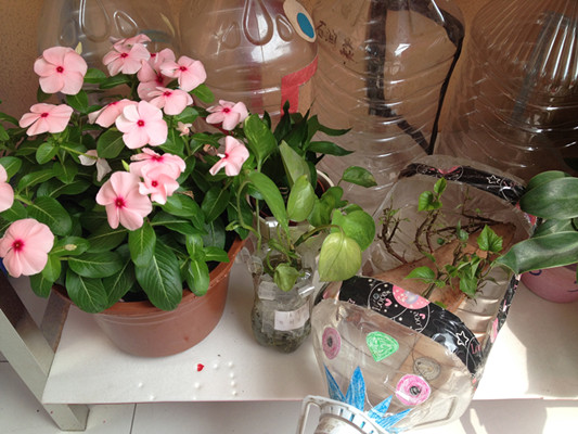 走近每个班的自然角,到处是一派生机勃勃的景象,瞧,班级里的自然角就成了孩子课间、游戏时经常去观赏聊天的小角落。开学看到发芽的山芋现在小苗长得很高而且旁边有生出了新芽儿;或发现土豆的芽儿颜色是紫色的,跟山芋不一样——秋天是一个可以让幼儿感受植物丰收的季节,在这个季节里做一些根茎类的种植,会让孩子不断有新的发现。