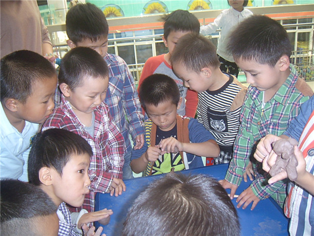 你瞧,大班的哥哥姐姐们正在认真细致地向弟妹传授团圆、搓捏、拉伸等技能;中班的弟妹也很专注地看着哥哥姐姐的动作,学习制作技能,有的小朋友还大胆地与哥哥姐姐进行交流,动手试做一下呢。