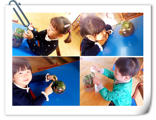 我园非常重视环境在儿童心理发展中所起的重要作用。区角间适当的摆放几盆绿色的植物,能有效地化解橱柜分割空间所造就的生硬感,同时又为教室带来了勃勃生机。幼儿可以对植物生长过程进行记录以及蒙氏工作“擦树叶”。教师对“自然角”的精心设计与指导,既可美化环境,也可让幼儿在“自然角”中精心照顾、关爱动植物,了解动植物的特点和生活习性,丰富自然知识,形成初步的科学态度,使幼儿的生活更加生动、有趣,丰富多彩。
