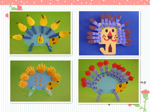 看似普通的塑料夹子,不仅可以夹衣服,还可以用来装饰漂亮的图画,比如用来做小刺猬身上的刺、孔雀身上的羽毛、螃蟹身上的脚等等,下面就一起来看看我们小朋友的创意夹夹乐吧!