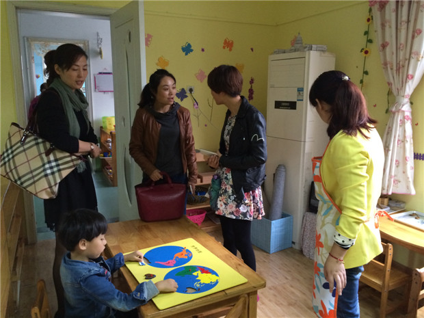 该园以蒙氏教育为特色,在参观中,老师们看到了该园各班教师巧妙地把蒙氏理念渗透于主题课程,根据各班幼儿的年龄特点、能力水平、主题内容及兴趣点,创设了幼儿喜欢且具有本班特色的区域。孩子们一进园,就自发地在各区域活动。