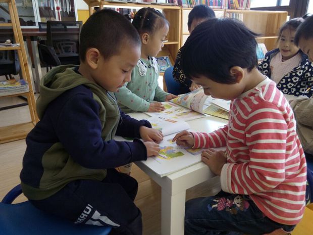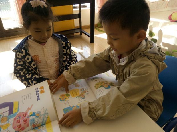 活动一开始,孩子们就迫不及待去挑选自己喜欢的图书。有的孩子和同伴一起阅读,时而发出愉悦的笑声;有的孩子一边用手指点着,一边小嘴巴轻轻说着;有的孩子一个人静静看着,眼神里充满着求知欲望;有的孩子看完一本书,用和气的语气和同伴商量着交换……孩子们沉浸在书的海洋里,看着说着,伴随着舒缓的音乐,时间如流水般静静地流淌。