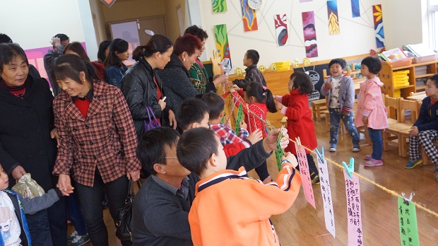 “水果猜谜会”中,教室被布置成了一个小小的猜谜馆,小朋友们一个个都兴致高涨。利用短短的十几分钟时间,小朋友跟爸爸妈妈一起猜水果谜语,答对的小朋友获得了小贴花跟小奖品,现场气氛十分的活跃。