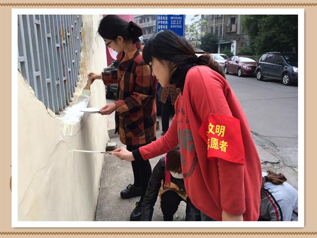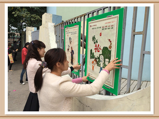 首先教师志愿者将园外破损的墙面重新粉刷,部分老师自制公益宣传板,让“二十四字”核心价值观及“八礼”的内容,以图文并貌形式展现在幼儿园的外墙上,让园外的每一条走廊都成为文化传播阵地,让整个校园内外环境都蕴含教育功能,营造浓郁的园内外文化氛围,让环境潜移默化地感染人的情绪,陶冶人的情操,提升人的境界,净化人的心灵。
