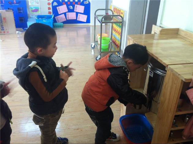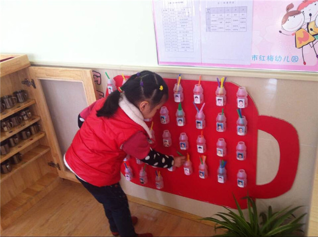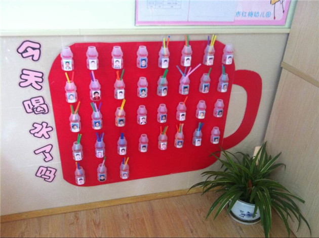 我们利用废旧材料“养乐多”的罐子,让每个小朋友都有一个属于自己的小杯子,他们每喝过一次水,就可以往小杯子中投放一根彩色的吸管,以此类推,到下午放学前,小朋友在园一天的饮水量和次数就一目了然了。而且当小朋友喝水的时候,发现同伴的杯子中没有吸管,就可以及时提醒他饮水,起到了较好的相互督促、提醒的作用,同时也提高了幼儿饮水的积极性,增添了幼儿饮水的兴趣。