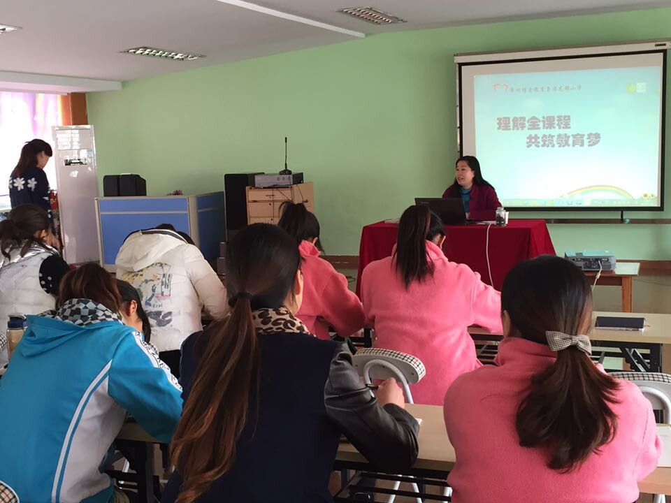 在戴霞副校长的介绍下,我们了解到“全课程”育人模式是:没了传统的科任教师,两位教师“包班”,承担全部课程教学;没了传统课本,一本书容纳一年级全部课程……在活动中,戴霞副校长还结合着一张张精彩的校园生活照片和发生在身边的小故事,向老师们介绍了孩子在学校的生活状态,用鲜活的教育事例畅谈了一年多来的实践感受。孩子们在教室里可以找到安全感,老师们竭尽全力地呵护着每个孩子的自尊心。