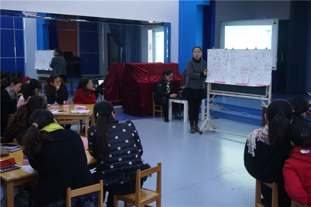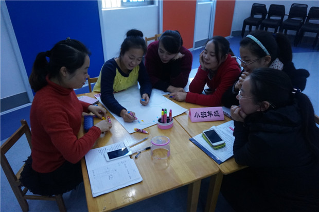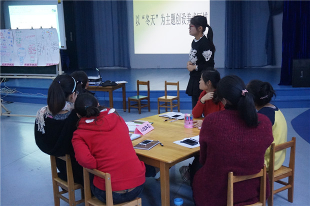 首先教师一起忆指南,提出开展美术区域活动教师做的好的方面及面对的困惑,对美术区域活动的新认识。其次看现状,讨论在美术区域的实施过程中可提升的地方。再次教师互动,围绕《冬天来了》这一主题,分组研讨创设美术区的方案,以绘画加简单文字说明的形式展现,其他年级组的老师评价方案,大家讨论得非常激烈,每个设计都包含了实幼教师的智慧。最后学习专家相关论文,共同提升。