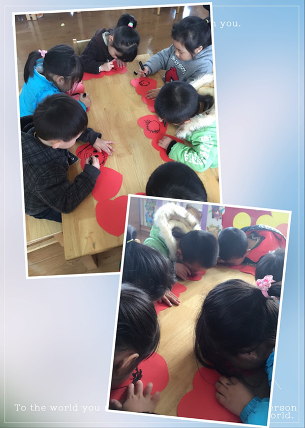 活动之始,老师们运用“故事、谈话、儿歌”等多种途径,引导孩子了解感恩节的由来,引发孩子主动关注周围人对自己成长付出的一切,并利用“把爱穿起来”这一手工活动,将自己满满的爱心穿成项链,送给幼儿园中为我们服务的人。说到感恩,孩子们认为最应该感谢的是自己的父母,感谢他们的悉心照顾,感谢他们的幸福陪伴,在“爱心卡”这一活动中,孩子们用稚嫩的线条,画出了最漂亮的妈妈。在老师的帮助下,将自己的唇印永远留在了妈妈的脸上。最后,孩子们与老师和着歌曲“感恩的心”,认真、专注地用手语表达着自己的感恩之心——感谢爸爸、妈妈、爷爷、奶奶、老师、朋友、阳光……幼儿之间、师幼之间交流着,感动着,高潮涌起……