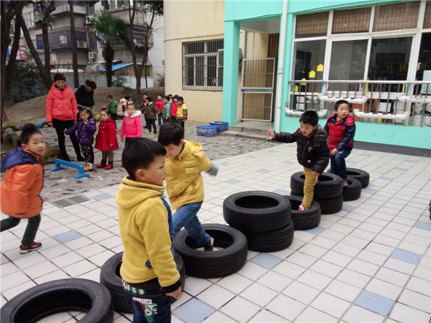 每天伴随着活泼、欢快的音乐,幼儿园的操场可谓一片沸腾,一片欢笑,各班教师带领孩子玩着晨间体育器械:花样轮胎、抛接纸球等,与孩子尽情游戏、锻炼。活动中老师根据本班幼儿的年龄和兴趣特点,变“我要幼儿活动”为幼儿“我要活动”,充分发挥孩子主动性,在讨论协商的基础上,决定活动内容与玩法。