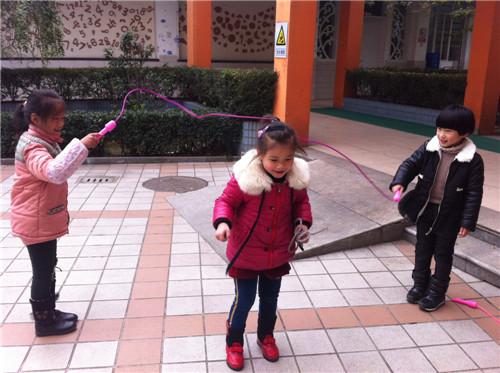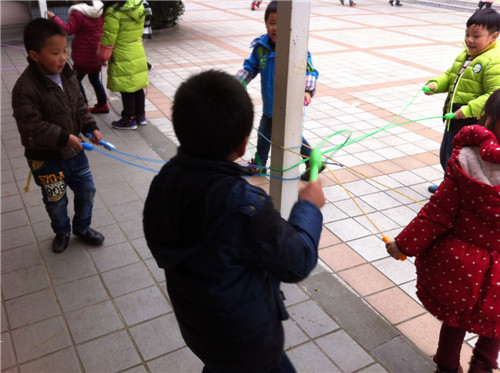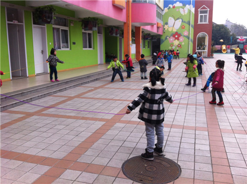 跳绳是冬天孩子们常玩的游戏之一,它材料简单,玩法多变,是孩子们锻炼身体的良好方法之一。户外活动中孩子们对跳绳非常感兴趣,自己还创造出了多种玩法。为了让幼儿在原有跳绳的基础上,引导其探索不同的跳绳方法,体验创造性玩绳的乐趣,发展幼儿的各项身体动作,我们红东幼儿园大班年级组设计了《花样玩绳》的活动。