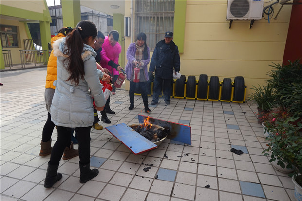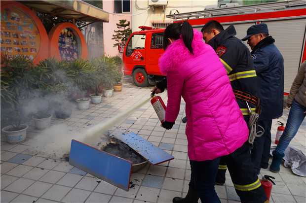 在培训现场,消防警员向大家介绍了干粉灭火器的使用方法:1、将灭火器提到起火地点附近站在火场的上风头,距火点3米左右。2、把灭火器上下颠倒几次,使筒内干粉松动。3、拔下保险销,一手握紧喷管,另一手捏紧压把,喷嘴对准火焰根部扫射。通过讲解,形象生动的示范,使参加培训的教职员工了解掌握了灭火器的正确使用方法。随后又带领教师进行了实战演,随着“火警”险情的出现,教师按照使用灭火器的四步法:“拔出插销、握住管子、对准火源根部、压下手把子”进行灭火实战,控制火情。