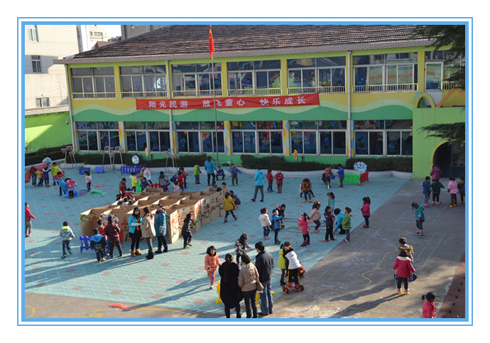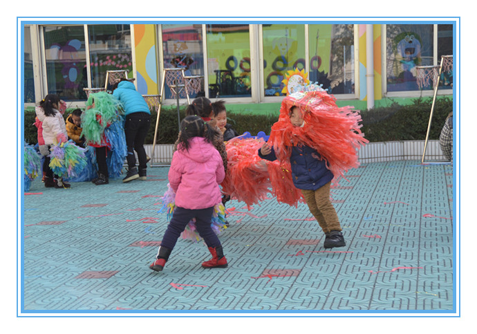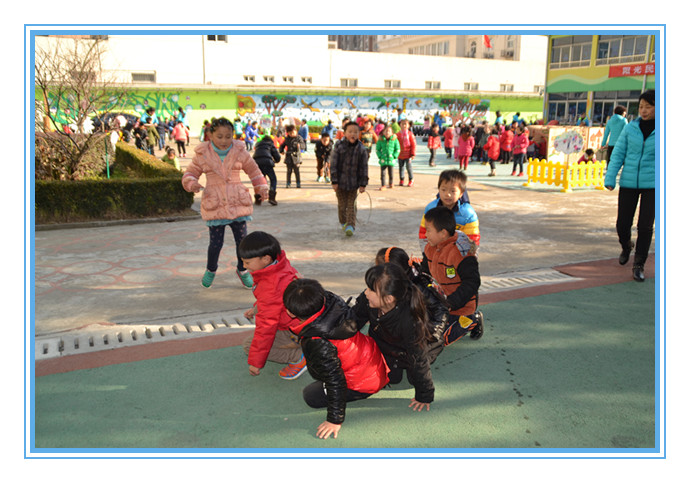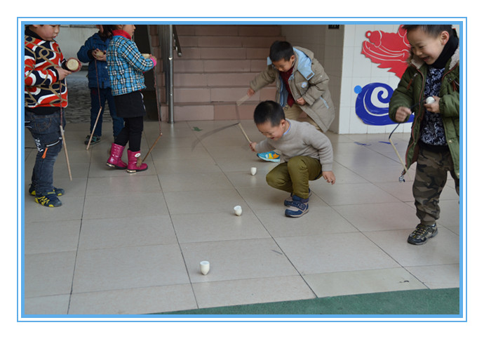 2014年12月26日上午,在茶山中心幼儿园开展了“结伴混齡,打造民游新乐园”为主题思想的混龄民间游戏活动。 本次活动,打破年龄班界限,全园整体设计活动,创新活动思路,共设计有滚铁环、、跳竹竿、打陀螺,舞龙舞狮、穿迷宫、扔沙包、踩高跷、跳皮筋等十余个民间游戏,幼儿自由选择喜欢的游戏进行。