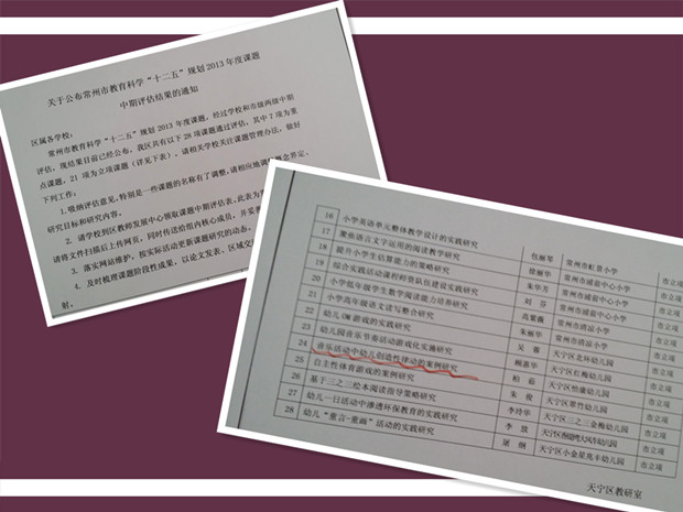 我园的教育科学“十二五”规划课题《音乐活动中幼儿创造性律动的案例研究》,在去年九月份被市级定位备案课题。通过一年多来的研究和实施,课题在各方面都取得了成果。近期更是传来喜讯,课题组通过了市教育科学规划小组办公室的中期评估,被推为市立项课题。